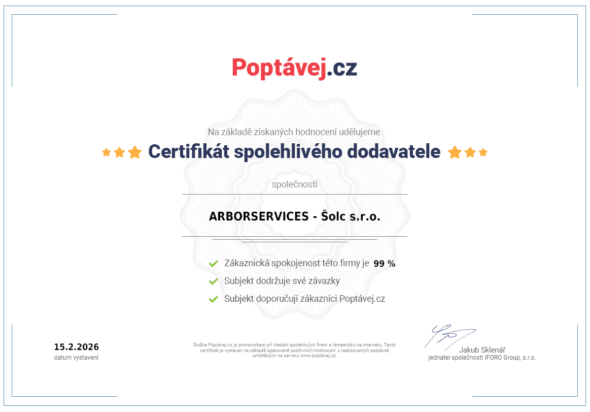 Odbornost našich zásahů garantujeme nejen praxí, ale i vzděláním – naši pracovníci jsou držiteli mezinárodního certifikátu ETW (European Tree Worker) a disponují veškerými potřebnými osvědčeními včetně pojištění odpovědnosti.